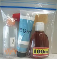 - Liquids in containers of 100 ml or less(however, this excludes items prohibited from being carried onboard, including infill gas for lighters and the like), when kept in a loose-fitting, transparent plastic bag (volume: 1 liter or less) that is resealable by a zipper. (See photo at right)